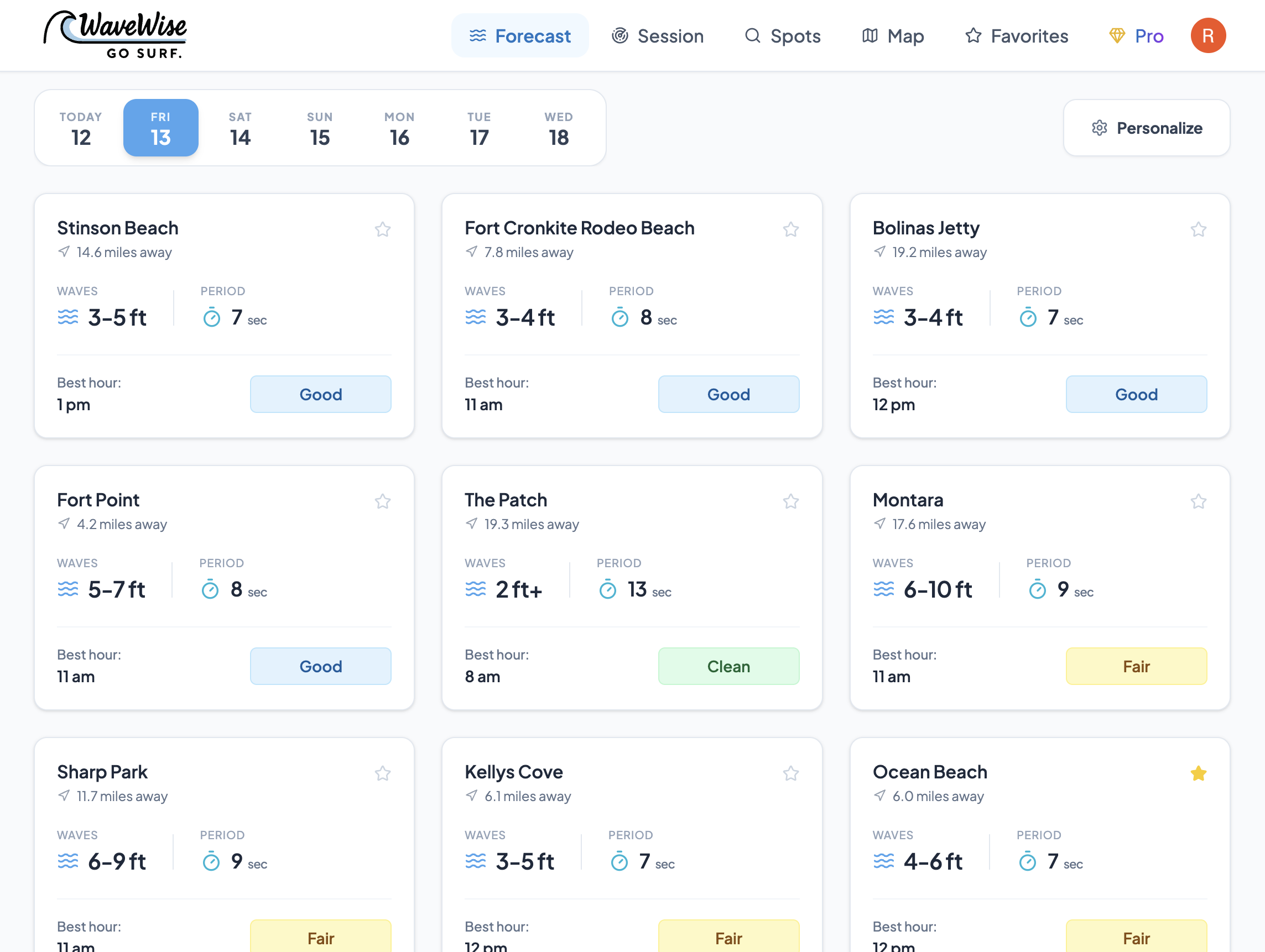 Session Finder analyzes the data across all your local breaks and gives you a simple, ranked list of the best upcoming windows. Just open the app and see exactly where and when to go.
